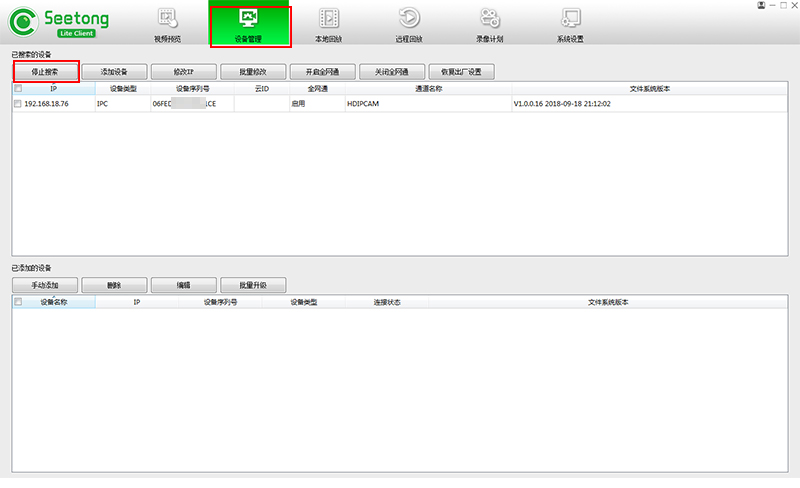 修改后重新點擊“開始搜索”;點擊“添加設備”即可成功添加監(jiān)控攝像機;