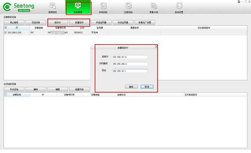 點擊“設備管理”-“開始搜索”選中要添加的網(wǎng)絡高清攝像機IP,根據(jù)當前網(wǎng)絡的IP地址,查看是否需要將網(wǎng)絡監(jiān)控頭的IP地址進行修改;