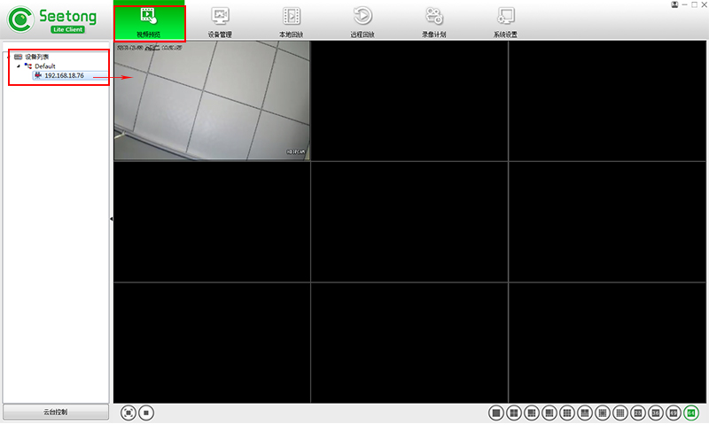 點擊軟件頂部“視頻預覽”雙擊設備列表中的監(jiān)控攝像機IP地址或是將監(jiān)控攝像機IP地址拖動到畫面框中,攝像機畫面成功顯示。