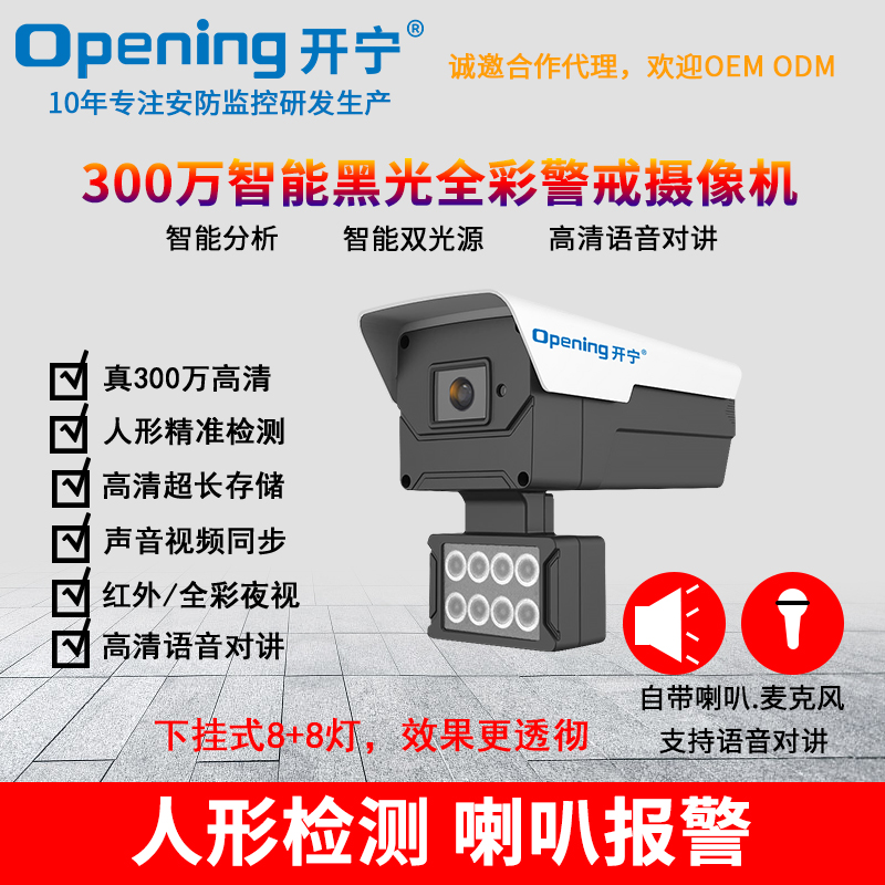 300萬(wàn)智能黑光全彩警戒網(wǎng)絡(luò)高清攝像機(jī),自帶人形檢測(cè)、語(yǔ)音對(duì)講、聲光報(bào)警、智能夜視模式、全彩夜視模式、紅外夜視模式,可自定義告警語(yǔ)音。