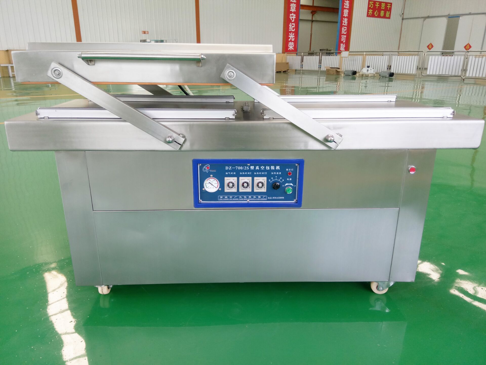 真空包裝機(jī)將食品裝入包裝袋,抽出包裝袋內(nèi)的空氣達(dá)到預(yù)定真空度后,再充入氮?dú)饣蚱渌旌蠚怏w,然后完成封口工序。
