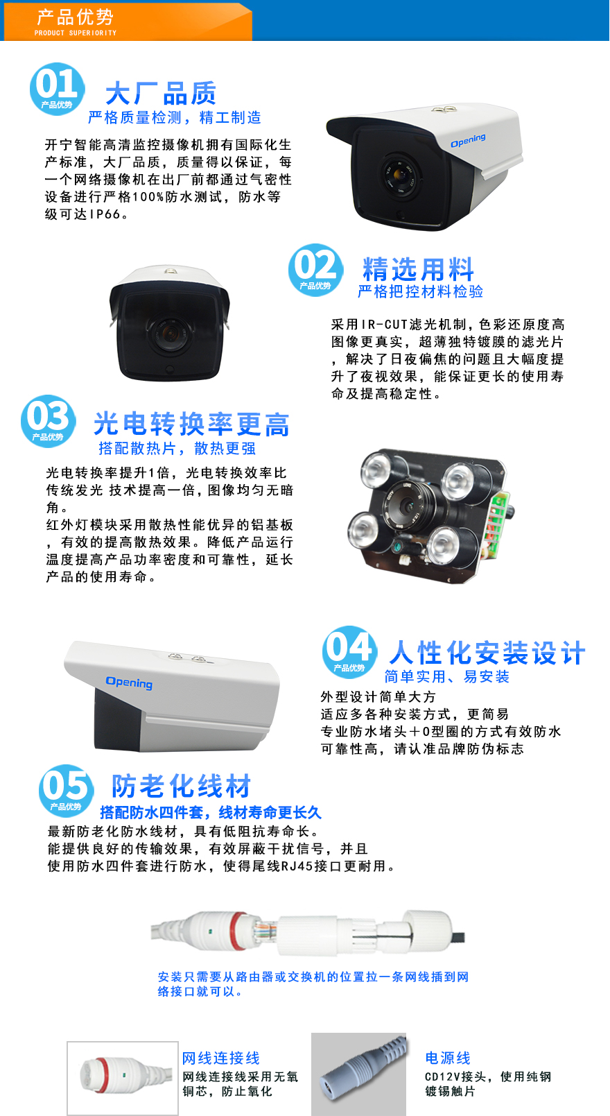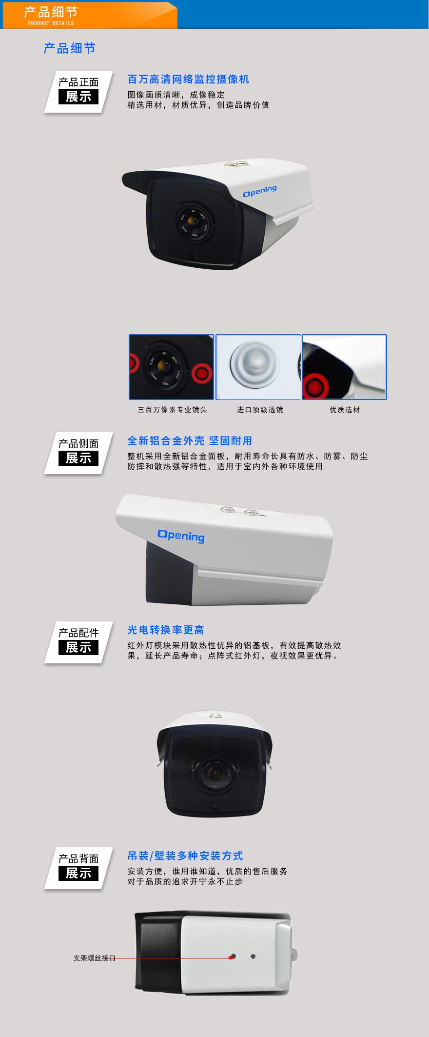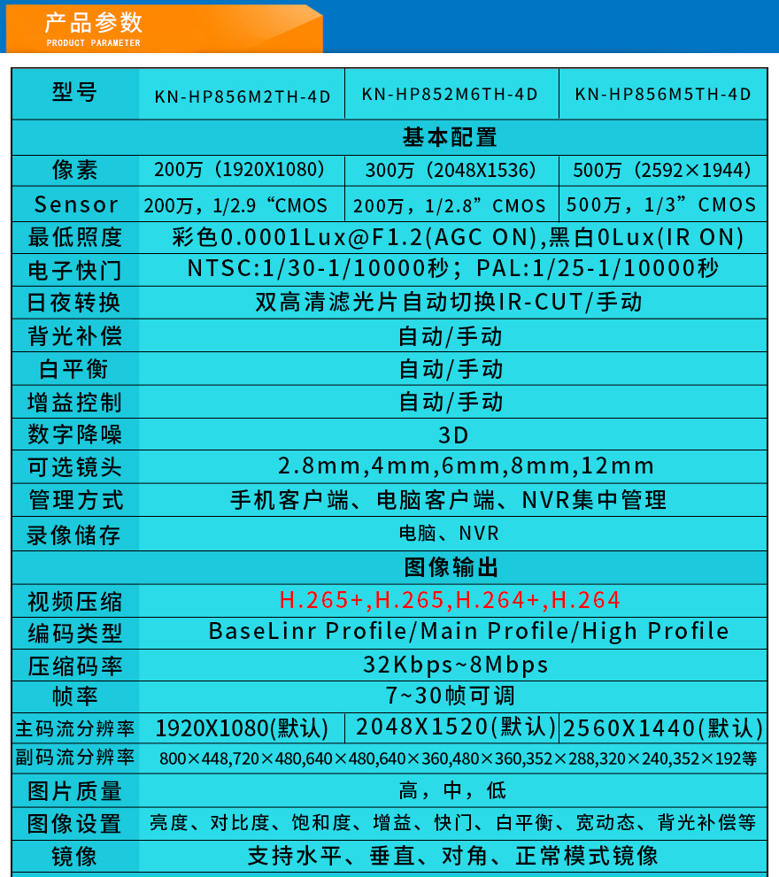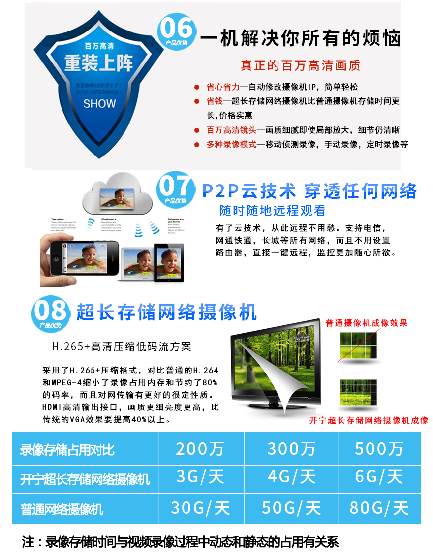 ★超長存儲、960P/1080P/1944P(130萬/200萬/500萬)、智能高清、全網(wǎng)通、低碼流、低照度、低功耗、H.264+/H.265+雙碼流、防靜電、防浪涌、過壓保護、移動偵測報警。