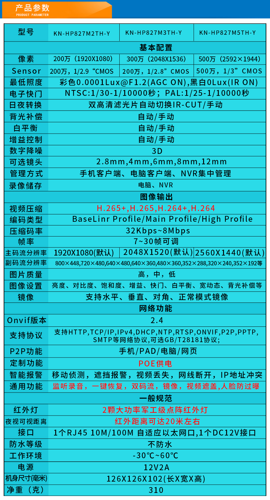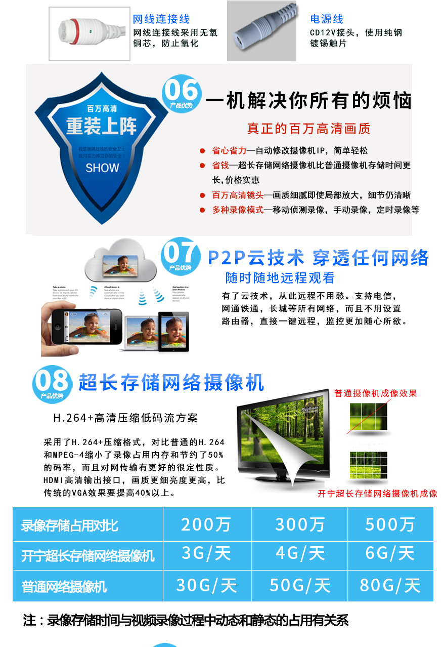 ★超長存儲、1080P/1536P/1944P(200萬/300萬/500萬)、智能高清、全網(wǎng)通、低碼流、低照度、低功耗、H.264+/H.265+雙碼流、防靜電、防浪涌、過壓保護(hù)、移動偵測報(bào)警。