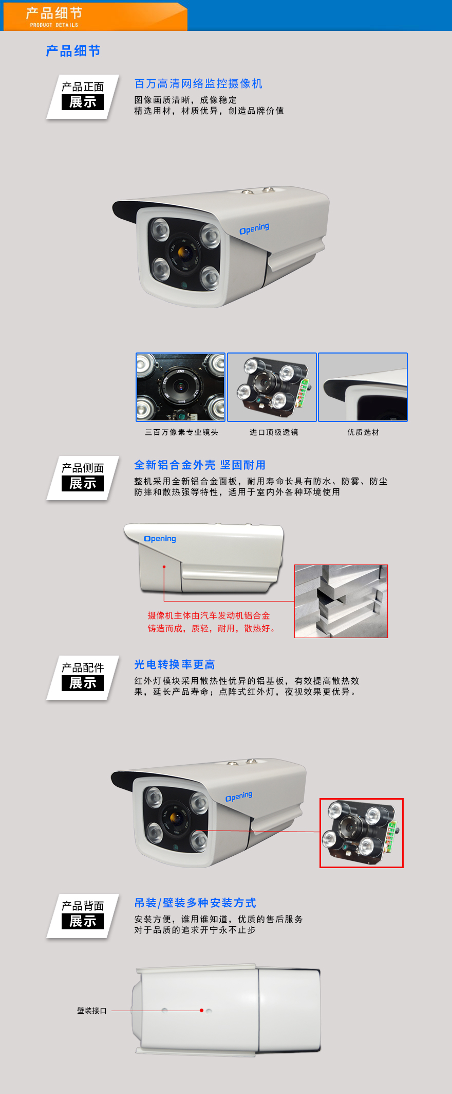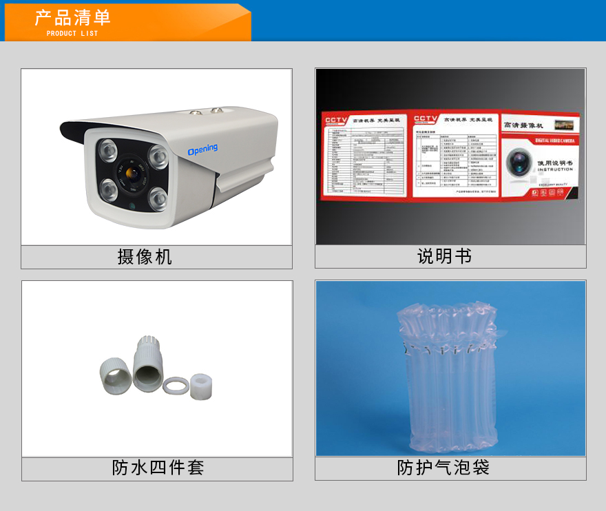 ★4顆美國普瑞LED白光陣列燈,白光10-30米,300萬星光專用高清定焦鏡頭(4mm/6mm可選),IP66防水全金屬外觀,DC12V供電。