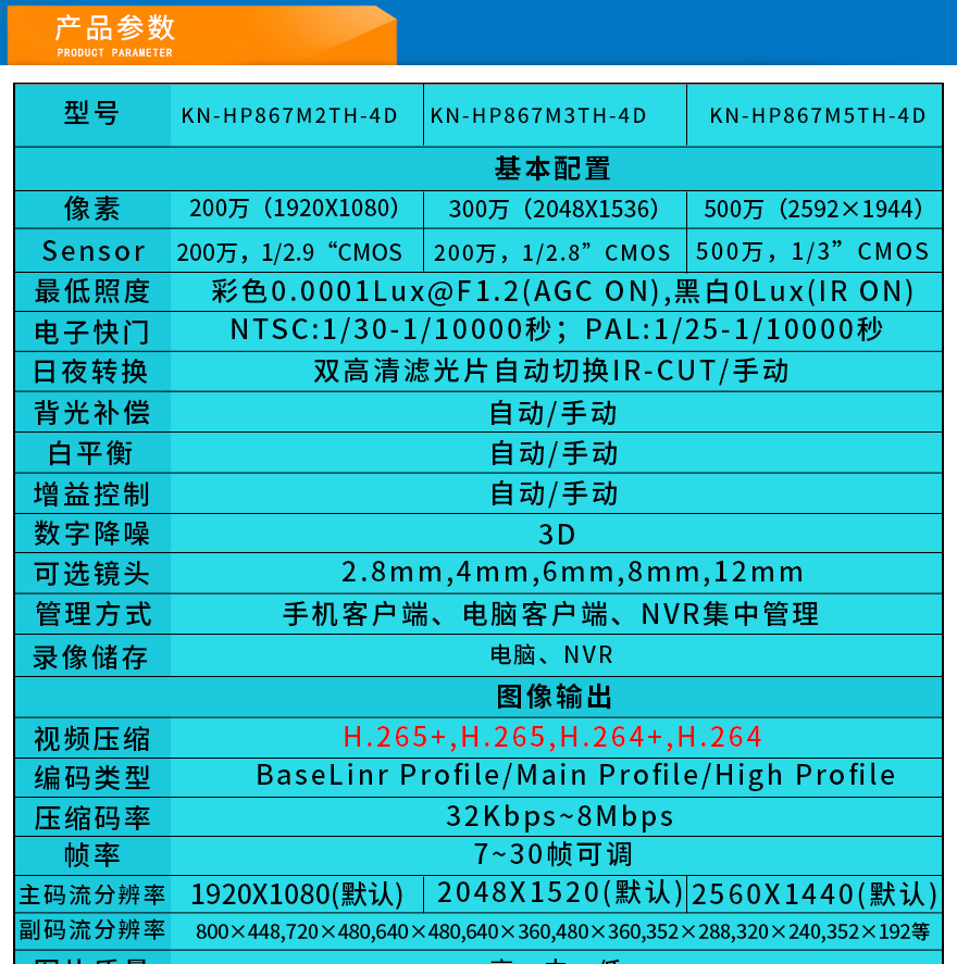 ★星光日夜全彩、960P/1080P(130萬/200萬)、超長存儲、智能高清、全網通、低碼流、低照度、低功耗、H.264+雙碼流、防靜電、防浪涌、過壓保護、移動偵測報警。