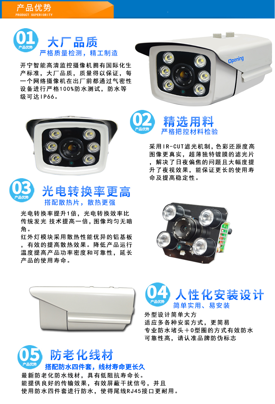 ★星光日夜全彩、960P/1080P(130萬/200萬)、超長存儲、智能高清、全網(wǎng)通、低碼流、低照度、低功耗、H.264+雙碼流、防靜電、防浪涌、過壓保護(hù)、移動偵測報(bào)警。