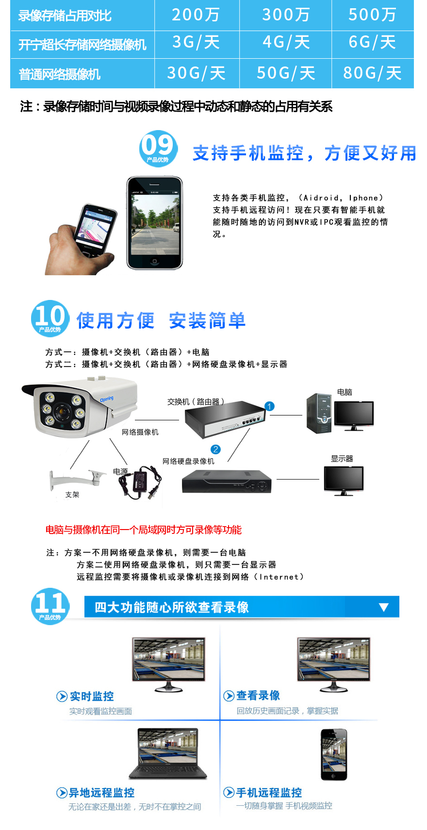★超長存儲網(wǎng)絡(luò)高清,1天只需10-20G存儲空間。