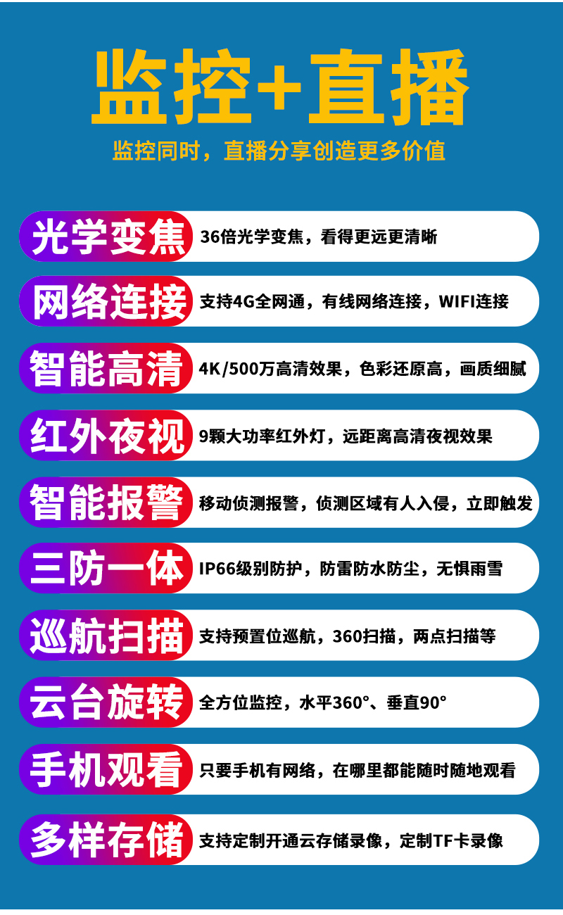 - 1、500萬(wàn)/800萬(wàn)7寸36倍監(jiān)控直播智能高清球機(jī),一個(gè)球機(jī)就是一套監(jiān)控直播系統(tǒng);支持360度旋轉(zhuǎn),最高轉(zhuǎn)速可達(dá)60度/S,支持預(yù)置點(diǎn)和巡航,36倍光學(xué)變焦,半金屬外觀,IP66防水等級(jí);