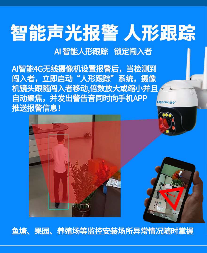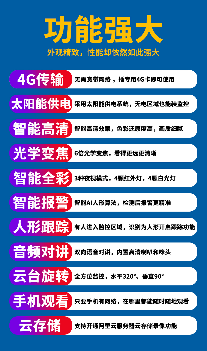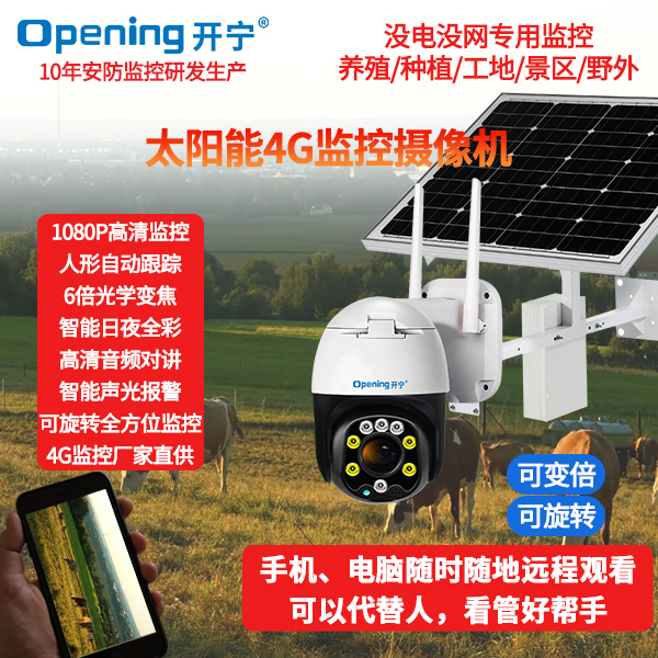 - ★這是一款開寧4G無線太陽能供電監(jiān)控系統(tǒng),一個機器就相當(dāng)于一套監(jiān)控系統(tǒng),無電無網(wǎng)也可以使用;