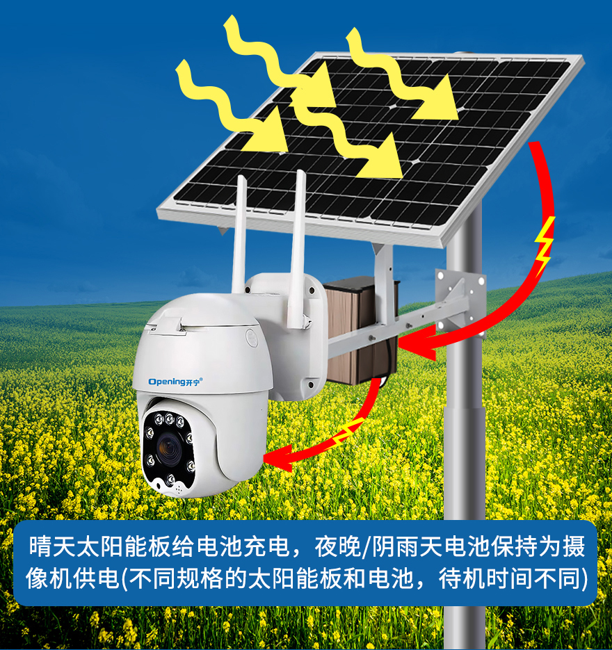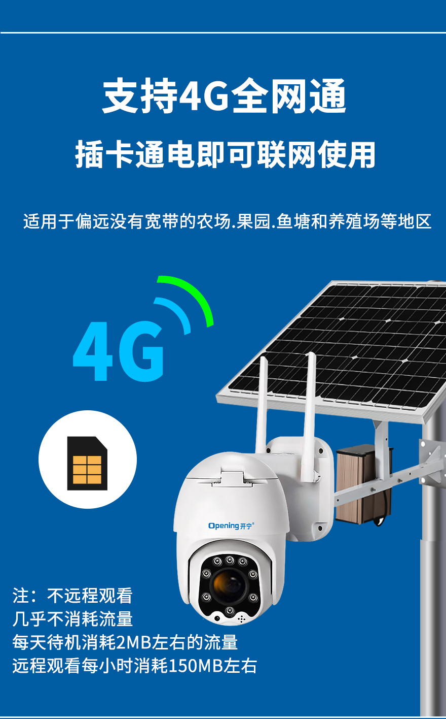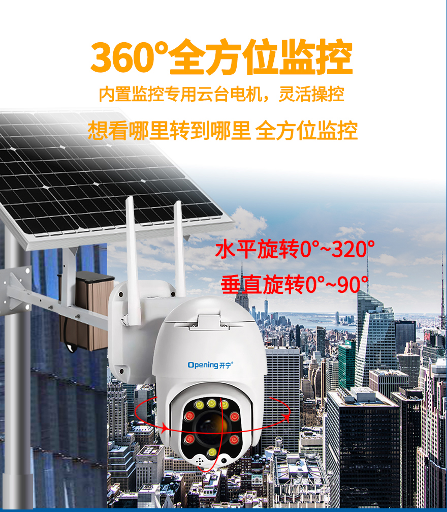- ★這是一款開寧4G無線太陽能供電監(jiān)控系統(tǒng),一個(gè)機(jī)器就相當(dāng)于一套監(jiān)控系統(tǒng),無電無網(wǎng)也可以使用;