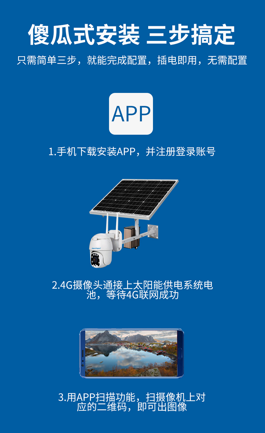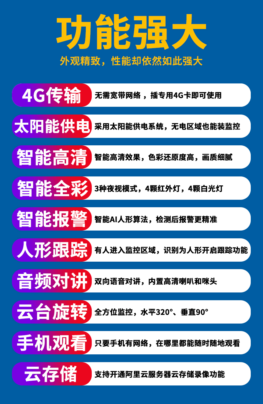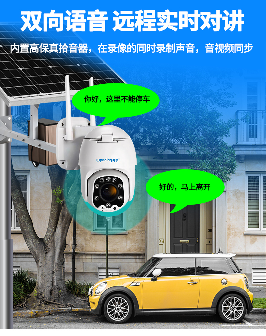 - ★這是一款開寧4G無線太陽能供電監(jiān)控系統(tǒng),一個(gè)機(jī)器就相當(dāng)于一套監(jiān)控系統(tǒng),無電無網(wǎng)也可以使用;