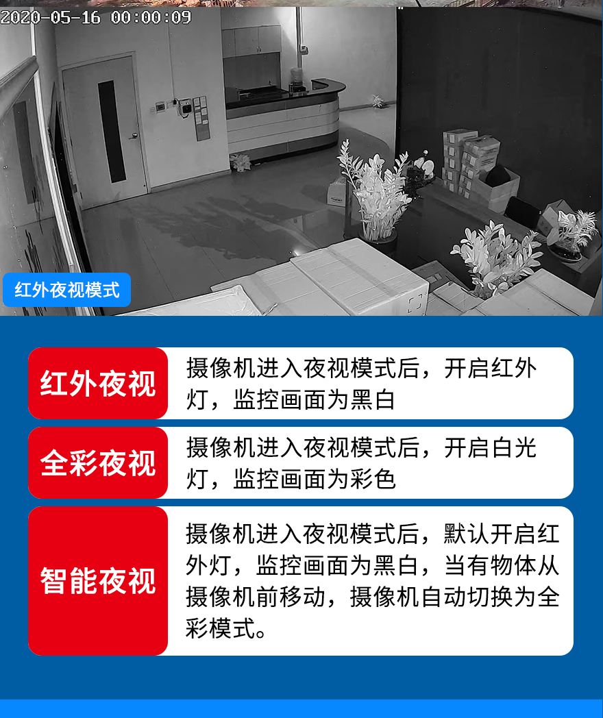 ★APP可選紅外模式、全彩模式或智能全彩模式三種模式中的一種;紅外模式-晚上則是黑白圖像,全彩模式-晚上則是彩色圖像,智能全彩模式-晚上正常是黑白,攝像頭前方有人或者物體移動的情況下白光燈亮呈現(xiàn)彩色圖像;