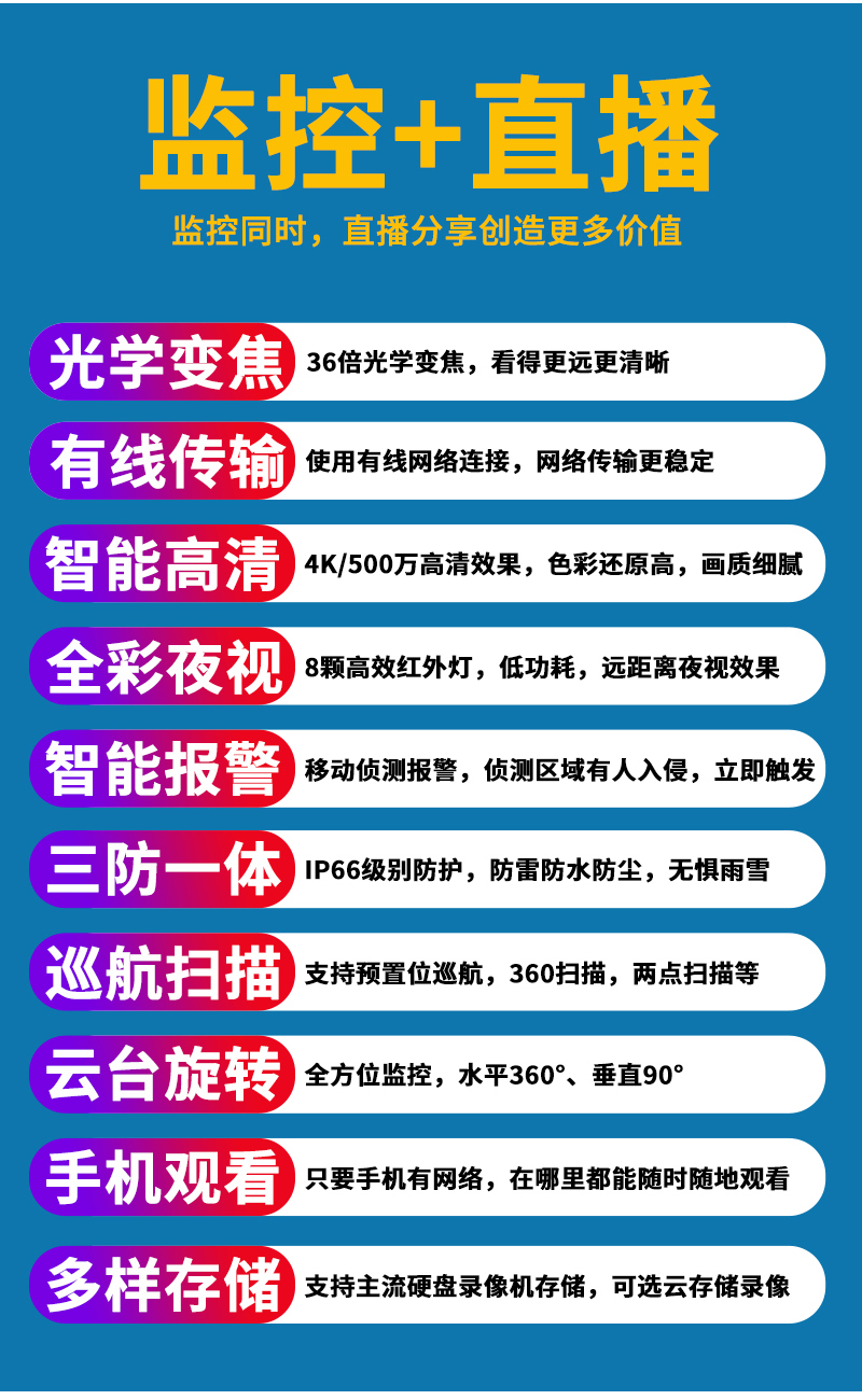 - 1、500萬/800萬4.5寸36倍監(jiān)控直播智能高清球機(jī),一個(gè)球機(jī)就是一套監(jiān)控直播系統(tǒng);支持360度旋轉(zhuǎn),最高轉(zhuǎn)速可達(dá)60度/S,支持預(yù)置點(diǎn)和巡航,36倍光學(xué)變焦,半金屬外觀,IP66防水等級(jí);