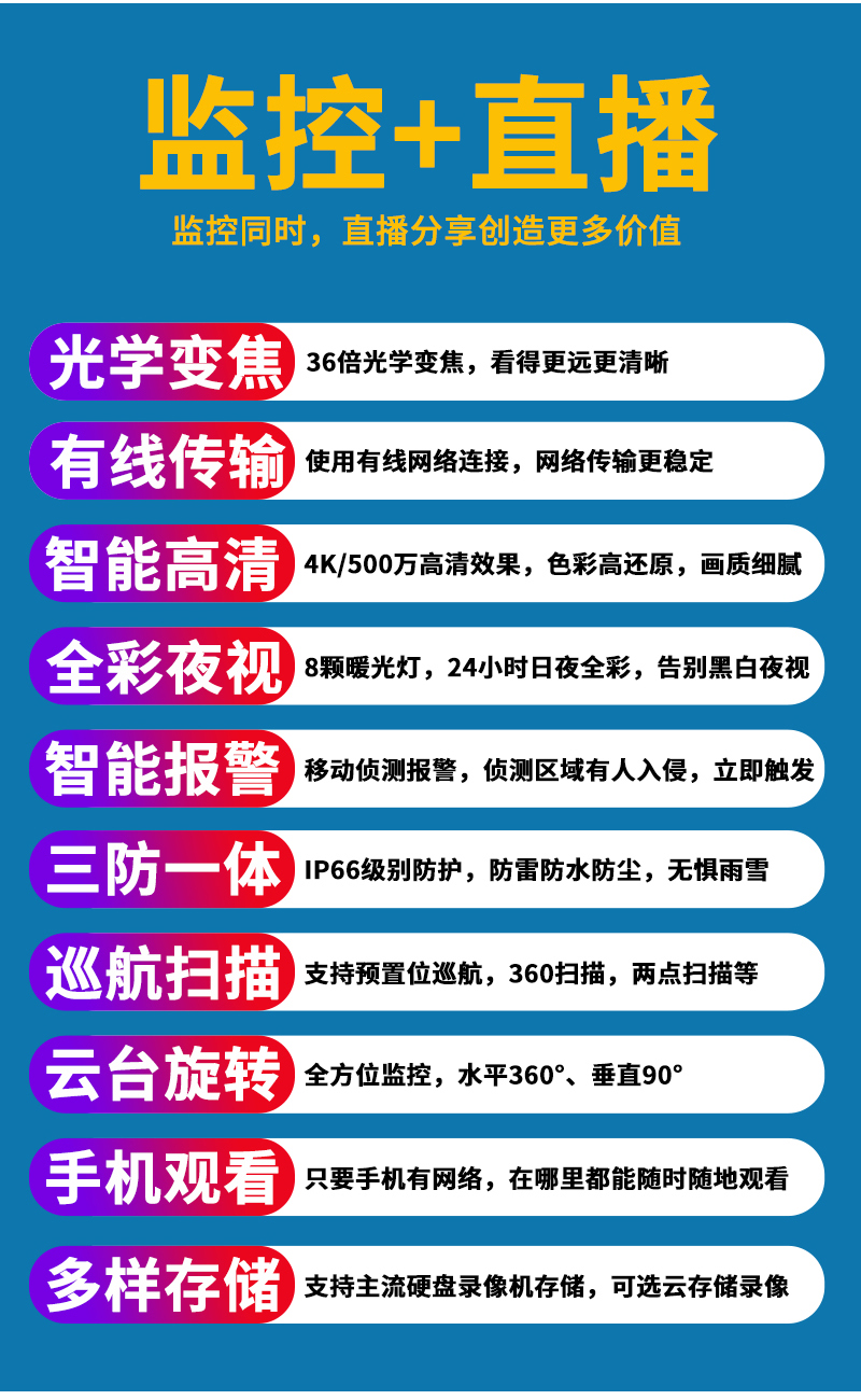 - 1、500萬/800萬6寸36倍監(jiān)控直播全彩智能高清球機(jī),一個(gè)球機(jī)就是一套監(jiān)控直播系統(tǒng);支持360度旋轉(zhuǎn),最高轉(zhuǎn)速可達(dá)60度/S,支持預(yù)置點(diǎn)和巡航,36倍光學(xué)變焦,半金屬外觀,IP66防水等級(jí);