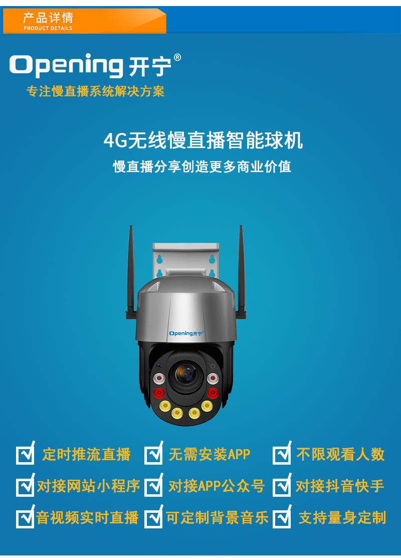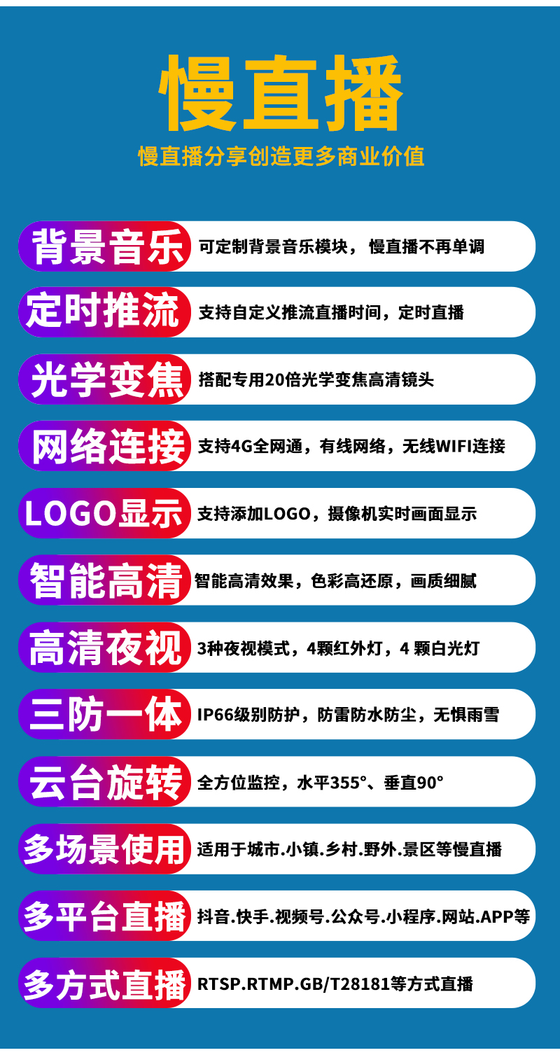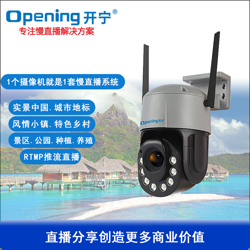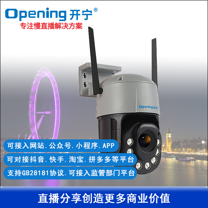 - 1、300萬4.5寸20倍有線/WIFI慢直播智能球,1個球機就是一套慢直播系統(tǒng);支持水平和垂直旋轉(zhuǎn); 2、不僅可以監(jiān)控監(jiān)管錄像,還可以實時慢直播分享創(chuàng)造更多商業(yè)價值; 3、景點直播.美麗鄉(xiāng)村.城市慢直播.農(nóng)業(yè)慢直播.文旅慢直播.融媒體慢直播.戶外直播等慢直播; 4、無需下載安裝APP,簡單實用;不限觀看人數(shù),創(chuàng)造更多商業(yè)價值; 5、RTMP推流慢直播智能球機;可生成監(jiān)控監(jiān)管直播二維碼,只需掃碼即可觀看慢直播; 6、可接入網(wǎng)站.公眾號.小程序.APP;可對接抖音.快手.視頻號.京東.淘寶.拼多多等平臺; 7、支持GB/T28181協(xié)議;可接公安.食品.工地.生產(chǎn).教育.畜牧.旅游等監(jiān)管部門平臺; 8、高清慢直播、本地錄像錄音、報警多功能于一體;支持64/128G/256G內(nèi)存卡; 9、4顆高效能點陣紅外燈,4顆高效能點陣白光燈,20倍變焦高清鏡頭,夜視5-100米; 10、APP可選擇紅外模式、全彩模式和智能模式三種模式其中一種模式; 11、智能模式,沒有物體移動紅外燈亮,有物體移動白光燈亮; 12、內(nèi)置高清保真拾音器,有聲有色實時慢直播;高清晰大功率喇叭,APP語音對講;DC12V供電; 13、免費提供集中管理平臺,可實現(xiàn)集中管理慢直播攝像頭,有效提高工作效率;