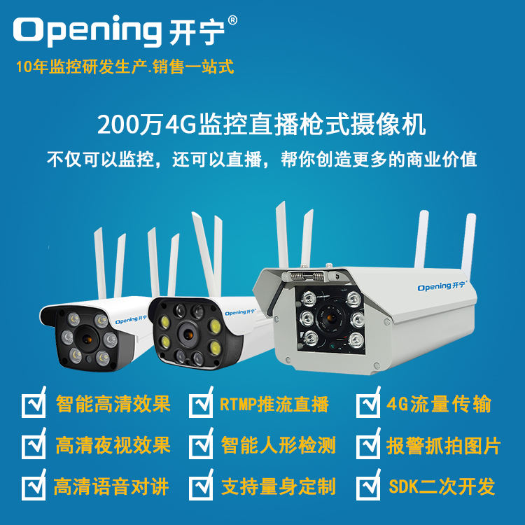 - 1、200萬/500萬4G智能監(jiān)控直播網(wǎng)絡(luò)高清防水?dāng)z像機,一個攝像機就是一套監(jiān)控直播系統(tǒng);