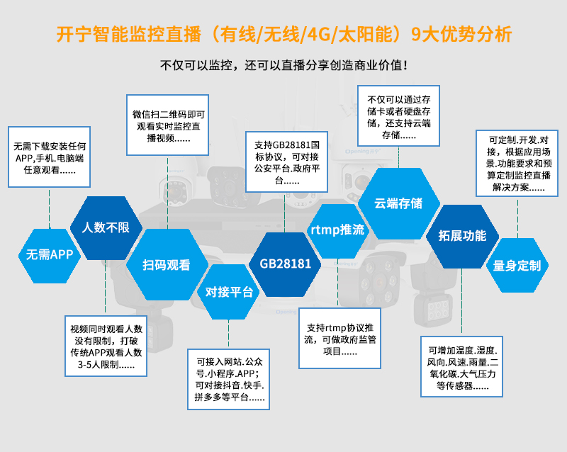 - 1、4G300萬慢直播智能小球,一個小球就是一套慢直播系統(tǒng); 2、不僅可以監(jiān)控監(jiān)管,還可以實(shí)時慢直播分享創(chuàng)造更多商業(yè)價值; 3、明廚亮灶.食品溯源.城市慢直播.美麗鄉(xiāng)村.農(nóng)業(yè)慢直播.景點(diǎn)慢直播.戶外慢直播等慢直播; 4、無需下載安裝APP,簡單實(shí)用;不限觀看人數(shù),創(chuàng)造更多商業(yè)價值; 5、RTMP推流直播高清攝像頭;可生成慢直播二維碼,只需掃碼即可觀看慢直播; 6、可接入網(wǎng)站.公眾號.小程序.APP;可對接抖音.快手.視頻號.淘寶.拼多多等平臺; 7、支持GB28181協(xié)議;可接公安.食品.工地.生產(chǎn).教育.畜牧.旅游等監(jiān)管部門平臺; 8、內(nèi)置智能4G模塊,沒有寬帶網(wǎng)絡(luò)的地方也能實(shí)現(xiàn)實(shí)時慢直播;另外支持有線功能; 9、支持64/128G/256G內(nèi)存卡;可另選配太陽能供電系統(tǒng)實(shí)現(xiàn)無電無網(wǎng)實(shí)時慢直播; 10、12顆高效能點(diǎn)陣紅外燈,12顆高效能點(diǎn)陣白光燈,鏡頭4MM/6MM可選,夜視5-50米; 11、APP可選擇紅外模式、全彩模式和智能模式三種模式其中一種模式; 12、智能模式,沒有物體移動紅外燈亮,有物體移動白光燈亮; 13、內(nèi)置高清拾音器,有聲有色實(shí)時直播;高清晰喇叭,APP語音對講,語音警戒報警;DC12V供電; 14、免費(fèi)提供集中管理平臺,可實(shí)現(xiàn)集中管理慢直播攝像頭,有效提高工作效率;