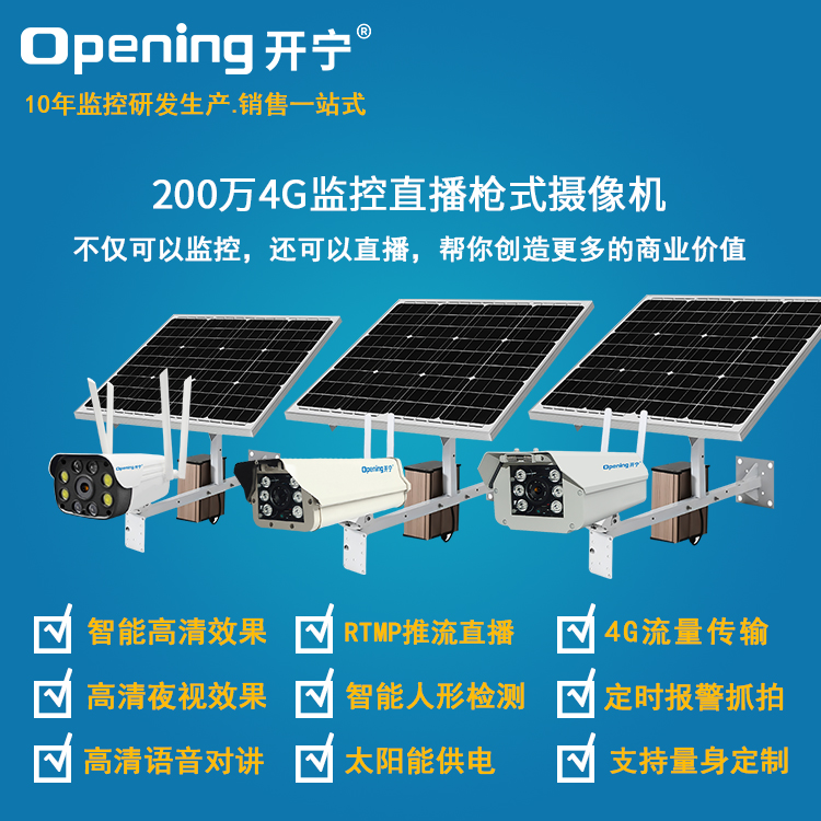 2、內(nèi)置智能4G模塊,沒(méi)有寬帶網(wǎng)絡(luò)的地方也能實(shí)現(xiàn)實(shí)時(shí)監(jiān)控直播;另外選配太陽(yáng)能供電系統(tǒng)可實(shí)現(xiàn)無(wú)電無(wú)網(wǎng)實(shí)時(shí)監(jiān)控直播;