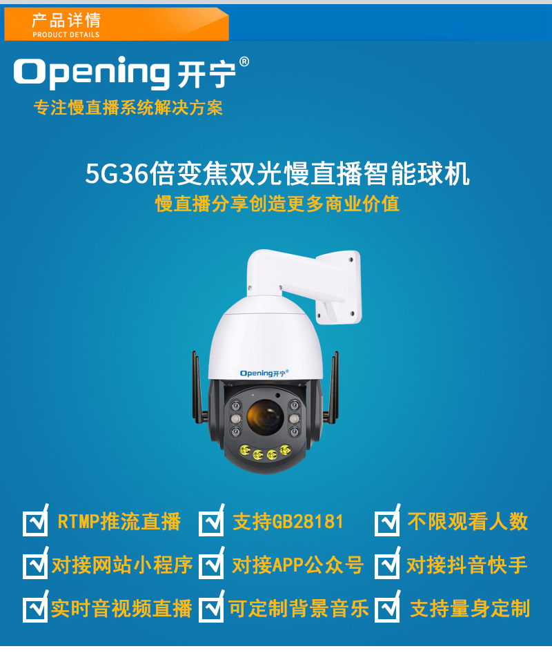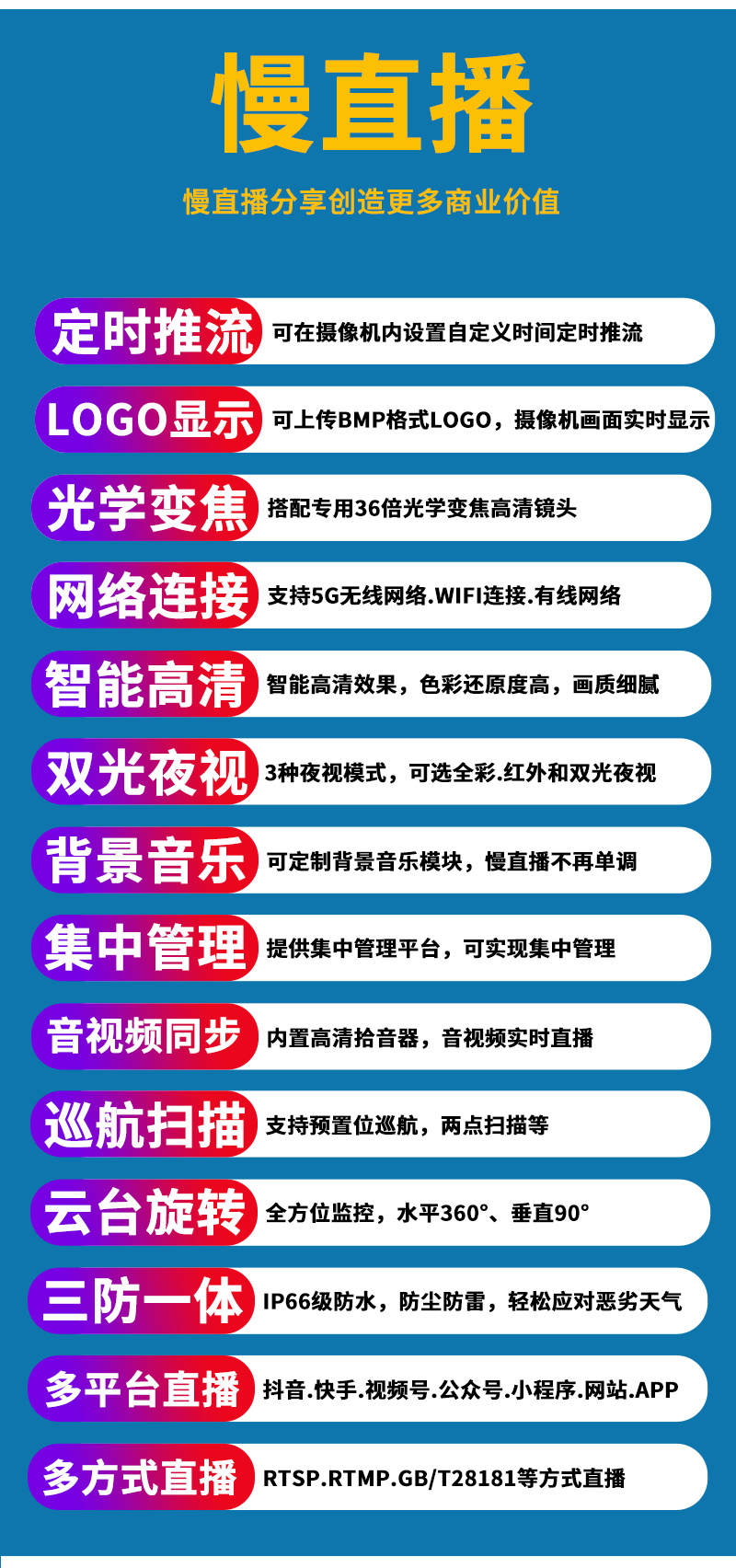 - 1、5G500萬/4K800萬4.5寸雙光慢直播智能球機,一個球機就是一套慢直播系統(tǒng);支持360度旋轉(zhuǎn),36倍光學變焦,半金屬外觀,IP66防水等級; 2、內(nèi)置工業(yè)級5G模塊,沒有寬帶網(wǎng)絡(luò)的地方也能實現(xiàn)實時慢直播;另外選配太陽能供電系統(tǒng)可實現(xiàn)無電無網(wǎng)實時慢直播; 3、支持5G/有線連接,沒有寬帶網(wǎng)絡(luò)用5G流量,有寬帶網(wǎng)絡(luò)用網(wǎng)線連接; 4、不僅可以監(jiān)控監(jiān)管錄像,還可以實時慢直播分享創(chuàng)造更多商業(yè)價值; 5、美景中國.智慧景區(qū).城市慢直播.5G慢直播.融媒體慢直播.央視頻慢直播.戶外慢直播等慢直播; 6、無需下載安裝APP,簡單實用;不限觀看人數(shù),創(chuàng)造更多商業(yè)價值; 7、RTMP推流直播高清攝像頭;可生成慢直播二維碼,只需掃碼即可觀看慢直播; 8、可接入網(wǎng)站.公眾號.小程序.APP;可對接抖音.快手.視頻號.京東.淘寶.拼多多等平臺; 9、支持GB28181協(xié)議;可接公安.食品.工地.生產(chǎn).教育.畜牧.旅游等監(jiān)管部門平臺; 10、支持另外定制內(nèi)置插卡,可存儲卡存儲錄像; 11、6顆高效能點陣紅外燈,4顆高效能點陣白光燈,夜視5-100米;36倍變焦高清鏡頭; 12、內(nèi)置高清保真拾音器,聲音視頻同步慢直播;DC12V供電; 13、免費提供集中管理平臺,可實現(xiàn)集中管理慢直播設(shè)備,有效提高工作效率; 14、慢直播首選4K800萬高清智能球機,美景中國、實景中國慢直播好幫手! 15、水平360度無限位旋轉(zhuǎn),垂直90度;水平轉(zhuǎn)速40度/秒,垂直轉(zhuǎn)速30度/秒;支持256個預置位 8組巡航8組掃描,支持水平掃描,2點區(qū)域掃描,隨機掃描;