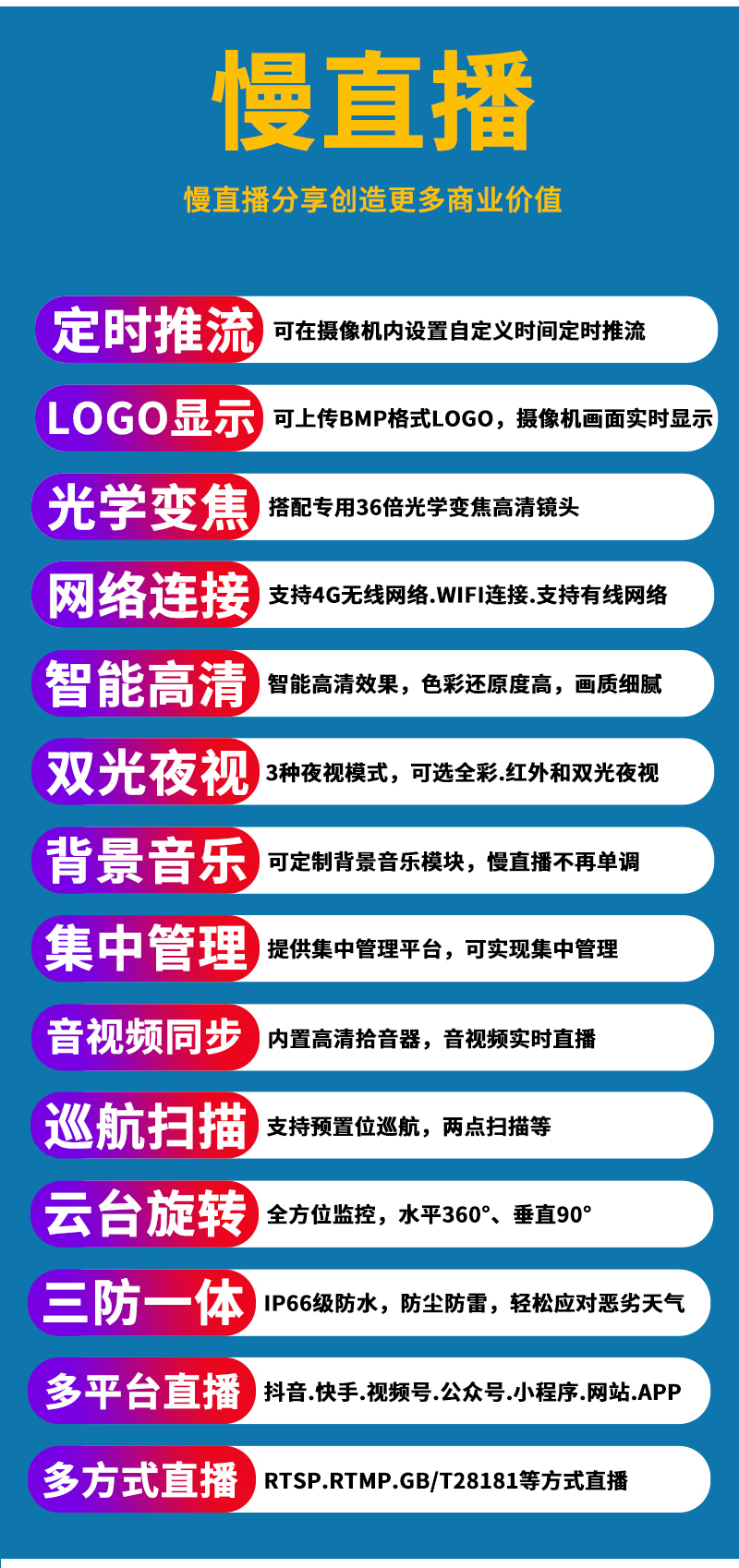 - 1、4G500萬(wàn)/4K800萬(wàn)4.5寸36倍雙光慢直播智能球機(jī),一個(gè)球機(jī)就是一套慢直播系統(tǒng);支持360度旋轉(zhuǎn),36倍光學(xué)變焦,半金屬外觀,IP66防水等級(jí); 2、內(nèi)置智能4G模塊,沒有寬帶網(wǎng)絡(luò)的地方也能實(shí)現(xiàn)實(shí)時(shí)慢直播; 3、不僅可以監(jiān)控監(jiān)管錄像,還可以實(shí)時(shí)慢直播分享創(chuàng)造更多商業(yè)價(jià)值; 4、美景中國(guó).智慧景區(qū).城市慢直播.動(dòng)物慢直播.融媒體慢直播.央視頻慢直播.戶外直播等慢直播; 5、無需下載安裝APP,簡(jiǎn)單實(shí)用;不限觀看人數(shù),創(chuàng)造更多商業(yè)價(jià)值; 6、RTMP推流直播高清攝像頭;可生成慢直播二維碼,只需掃碼即可觀看慢直播; 7、可接入網(wǎng)站.公眾號(hào).小程序.APP;可對(duì)接抖音.快手.視頻號(hào).淘寶.拼多多等平臺(tái); 8、支持GB28181協(xié)議;可接公安.食品.工地.生產(chǎn).教育.畜牧.旅游等監(jiān)管部門平臺(tái); 9、支持4G/WiFi/有線連接,沒有寬帶網(wǎng)絡(luò)用4G流量,有寬帶網(wǎng)絡(luò)可用wifi/網(wǎng)線連接; 10、6顆高效能點(diǎn)陣紅外燈,4顆高效能點(diǎn)陣白光燈,夜視5-100米;36倍變焦高清鏡頭; 11、內(nèi)置高清保真拾音器,聲音視頻同步慢直播;DC12V供電; 12、免費(fèi)提供集中管理平臺(tái),可實(shí)現(xiàn)集中管理慢直播攝像頭,有效提高工作效率; 13、慢直播首選4K800萬(wàn)高清智能球機(jī),美景中國(guó)、實(shí)景中國(guó)慢直播好幫手! 14、水平360度無限位旋轉(zhuǎn),垂直90度;水平轉(zhuǎn)速40度/秒,垂直轉(zhuǎn)速30度/秒;支持256個(gè)預(yù)置位 8組巡航8組掃描,支持水平掃描,2點(diǎn)區(qū)域掃描,隨機(jī)掃描;