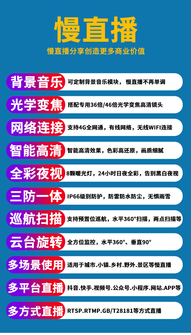 - 1、500萬/800萬7寸4G全彩慢直播智能球機(jī),一個球機(jī)就是一套慢直播系統(tǒng);支持360度旋轉(zhuǎn),36倍/46倍光學(xué)變焦,金屬外觀,IP66防水等級;