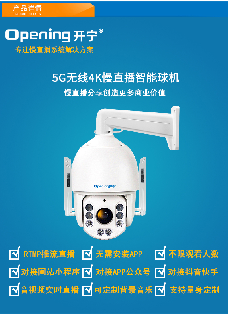 - 1、500萬/800萬7寸5G全彩慢直播智能球機(jī),一個(gè)球機(jī)就是一套慢直播系統(tǒng);支持360度旋轉(zhuǎn),36倍/46倍光學(xué)變焦,金屬外觀,IP66防水等級(jí);