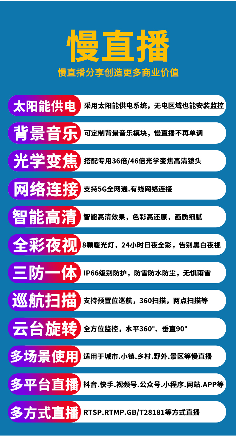 - 1、500萬/800萬7寸5G全彩慢直播智能球機(jī),一個球機(jī)就是一套慢直播系統(tǒng);支持360度旋轉(zhuǎn),36倍/46倍光學(xué)變焦,金屬外觀,IP66防水等級;