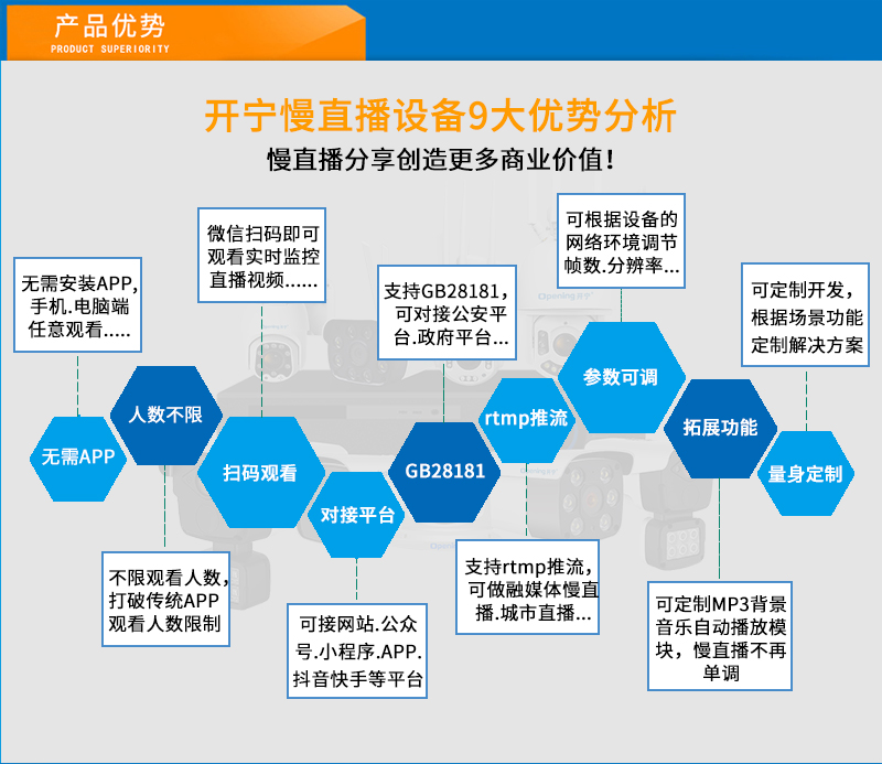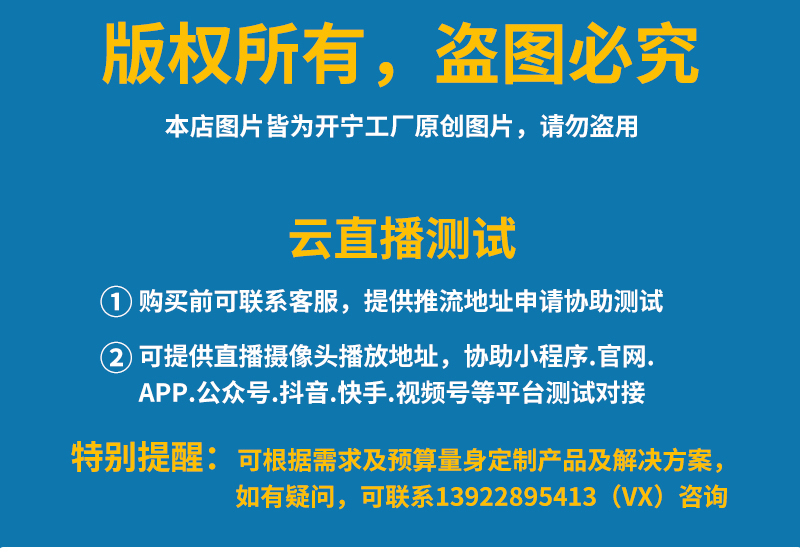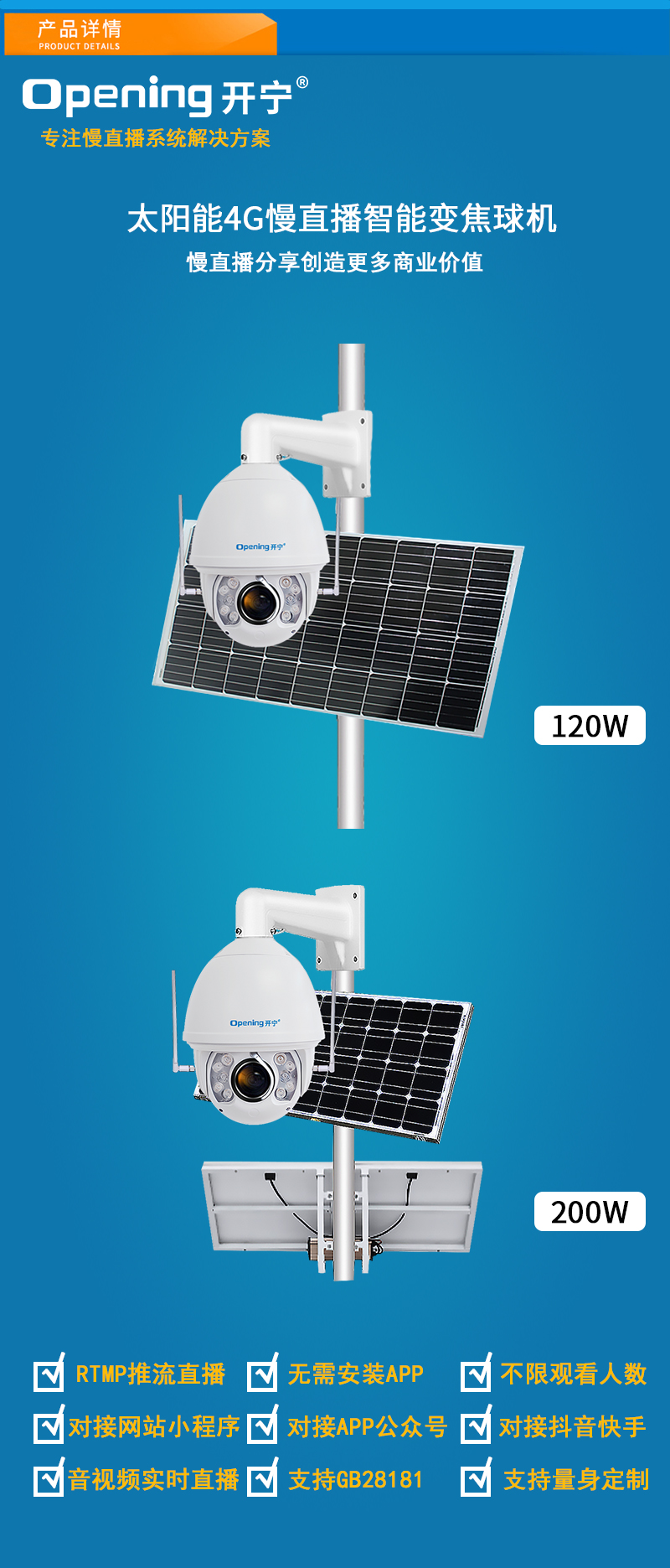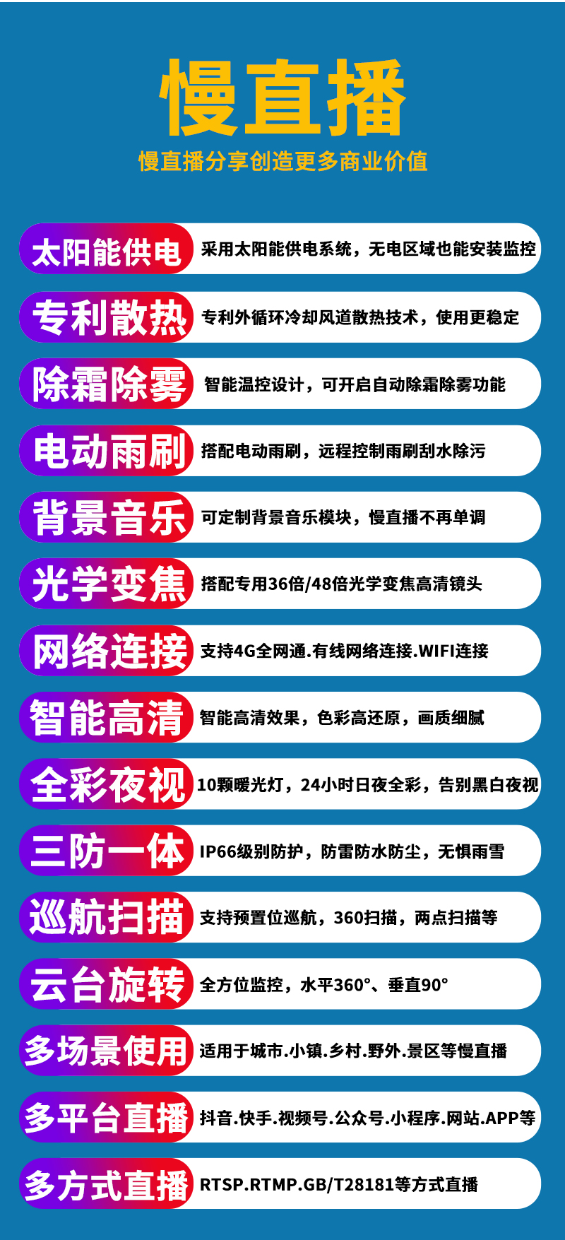 - 1、4K800萬7寸4G全彩慢直播智能球機,一個球機就是一套慢直播系統(tǒng);水平360度無限位旋轉(zhuǎn),垂直100度旋轉(zhuǎn);支持256個預(yù)置位 8組巡航8組掃描,支持水平掃描,2點區(qū)域掃描,隨機掃描;36倍/48倍光學(xué)變焦,金屬外觀,IP66防水等級; 2、采用外循環(huán)冷卻風道散熱技術(shù)和視頻分析調(diào)光技術(shù),整體提升產(chǎn)品使用壽命1倍以上; 3、自動除霜、除霧功能(手動開啟),外置雨刷設(shè)計,確保視頻高清畫面更清晰; 4、內(nèi)置智能5G模塊,沒有寬帶網(wǎng)絡(luò)的地方也能實現(xiàn)實時慢直播; 5、支持5G/有線連接,沒有寬帶網(wǎng)絡(luò)用5G流量,有寬帶網(wǎng)絡(luò)用網(wǎng)線連接; 6、不僅可以監(jiān)控錄像,還可以實時慢直播分享創(chuàng)造更多商業(yè)價值; 7、美景中國.城市慢直播.5G慢直播.融媒體慢直播.央視頻慢直播.交通慢直播.戶外慢直播等慢直播 8、無需下載安裝APP,簡單實用;不限觀看人數(shù),創(chuàng)造更多商業(yè)價值; 9、RTMP推流直播高清攝像頭;可生成慢直播二維碼,只需掃碼即可觀看慢直播; 10、可接入網(wǎng)站.公眾號.小程序.APP;可對接抖音.快手.視頻號.視頻號.京東.淘寶.拼多多等平臺; 11、支持GB28181協(xié)議;可接公安.食品.工地.生產(chǎn).教育.畜牧.旅游等監(jiān)管部門平臺; 12、支持另外定制內(nèi)置插卡,可存儲卡存儲錄像; 13、10顆進口大功率高效能點陣暖光燈,紅外夜視1-160米;;36倍/48倍變焦高清鏡頭; 14、內(nèi)置高清保真拾音器,聲音視頻同步慢直播;DC12V供電; 15、免費提供集中管理平臺,可實現(xiàn)集中管理播監(jiān)控攝像頭,有效提高工作效率;; 16、慢直播首選4K800萬智能全彩超高清智能球機,美景中國、實景中國慢直播好幫手! 17、可另外配置高清晰大功率喇叭,APP語音對講,智能語音警戒報警; 18、水平360度無限位旋轉(zhuǎn),垂直100度;水平轉(zhuǎn)速0.01度-120度/秒,垂直轉(zhuǎn)速0.01度-100度/秒;支持256個預(yù)置位 8組巡航8組掃描,支持水平掃描,2點區(qū)域掃描,隨機掃描;