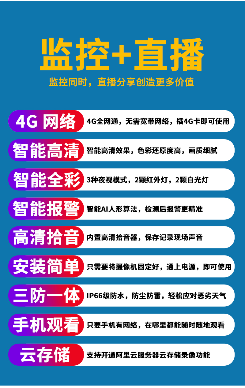 2、內(nèi)置智能4G模塊,沒有寬帶網(wǎng)絡(luò)的地方也能實(shí)現(xiàn)實(shí)時(shí)監(jiān)控直播;