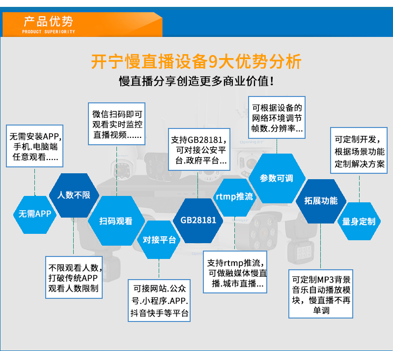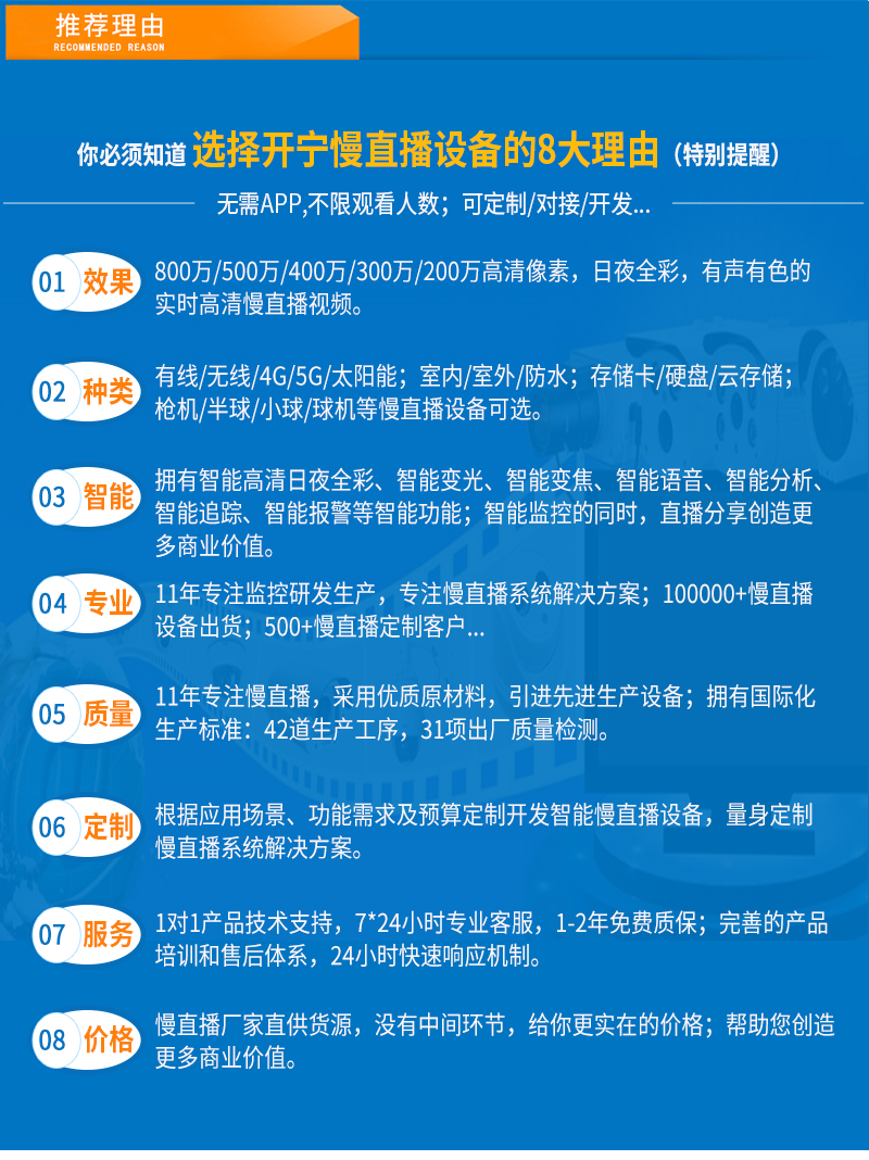 - 1、一個5G紅外高清監(jiān)控直播防爆半球就是一套監(jiān)控直播系統(tǒng); 3、明廚亮灶.政府監(jiān)管.智慧工地.智慧農(nóng)業(yè).智慧社區(qū).景點直播.電視臺慢直播.融媒體慢直播.文旅慢直播.城市慢直播.5G慢直播等24小時實時慢直播; 4、無需下載安裝APP,簡單實用;不限觀看人數(shù),創(chuàng)造更多商業(yè)價值; 5、RTMP推流直播高清攝像頭;可生成監(jiān)控直播二維碼,只需掃碼即可觀看監(jiān)控直播; 6、可接入網(wǎng)站.公眾號.小程序.APP;可對接抖音.快手.視頻號.京東.淘寶.拼多多等平臺; 7、支持GB/T28181協(xié)議;可接公安.食品.工地.生產(chǎn).教育.畜牧.旅游等政府監(jiān)管部門平臺; 8、免費提供集中管理平臺,可實現(xiàn)集中管理直播攝像頭,有效提高工作效率;
