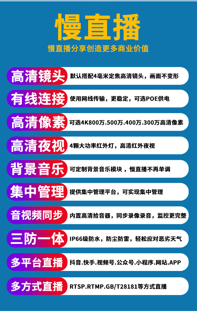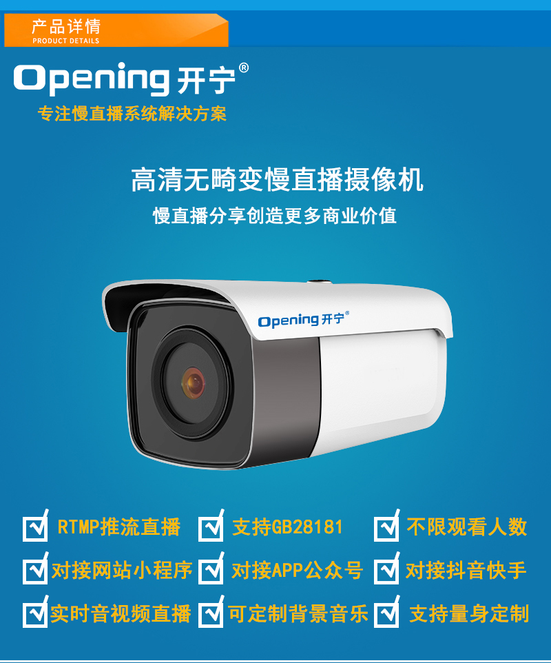 - 1、4K800萬/500萬/400萬/300萬紅外高清無畸變慢直播攝像機,一個攝像機就是一套監(jiān)控直播系統(tǒng);
