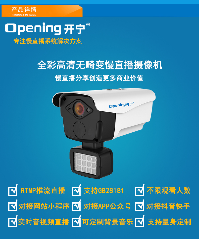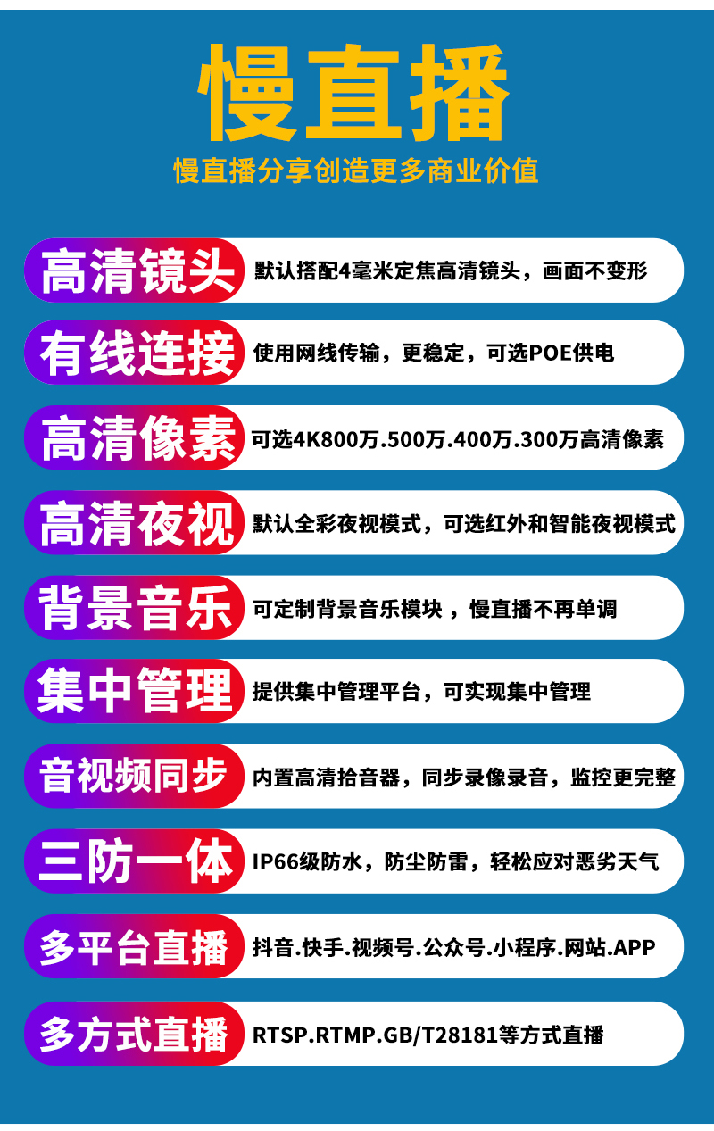 - 1、300萬/500萬/800萬/1200萬雙光慢直播高清攝像機,一個攝像機就是一套慢直播系統(tǒng);