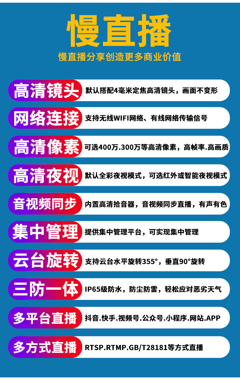 4、明廚亮灶.在線驗廠.城市慢直播.美麗鄉(xiāng)村.農(nóng)業(yè)慢直播.幼兒園慢直播.戶外慢直播等慢直播;