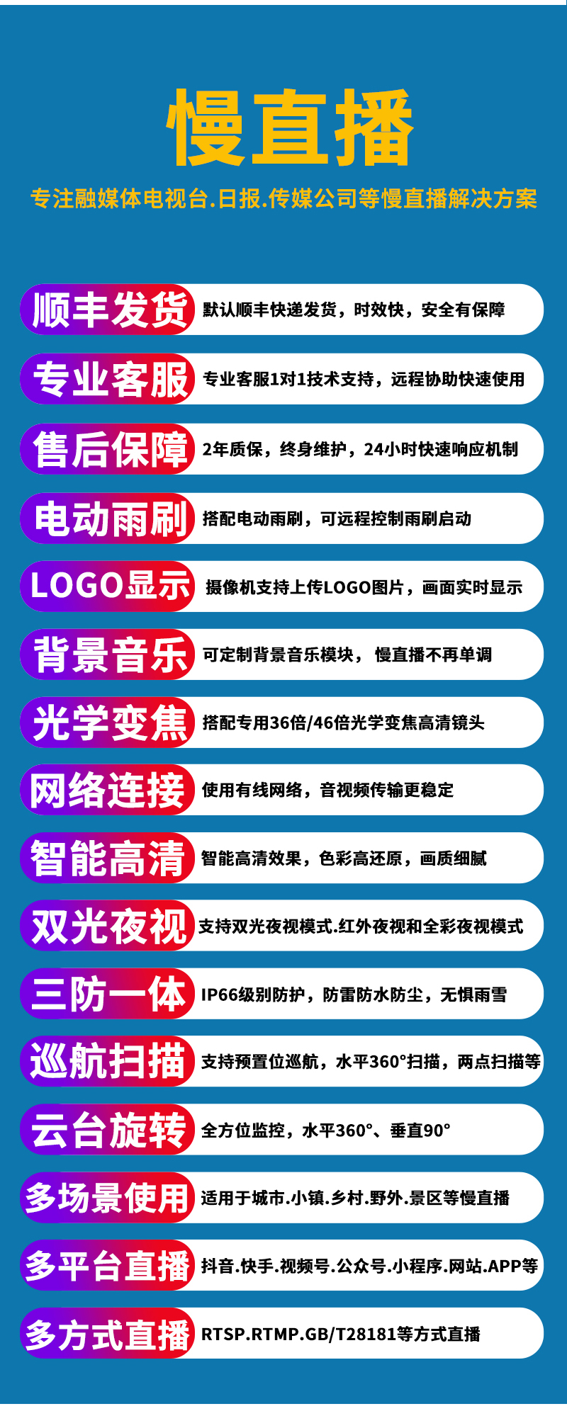 - 1、800萬4K6寸金屬36倍/48倍全彩慢直播智能高清球機,一個球機就是一套慢直播系統(tǒng);支持360度旋轉(zhuǎn),最高轉(zhuǎn)速可達60度/S,支持預(yù)置點和巡航,36倍/48倍光學(xué)變焦,半金屬外觀,IP66防水等級;支持雨刮功能;