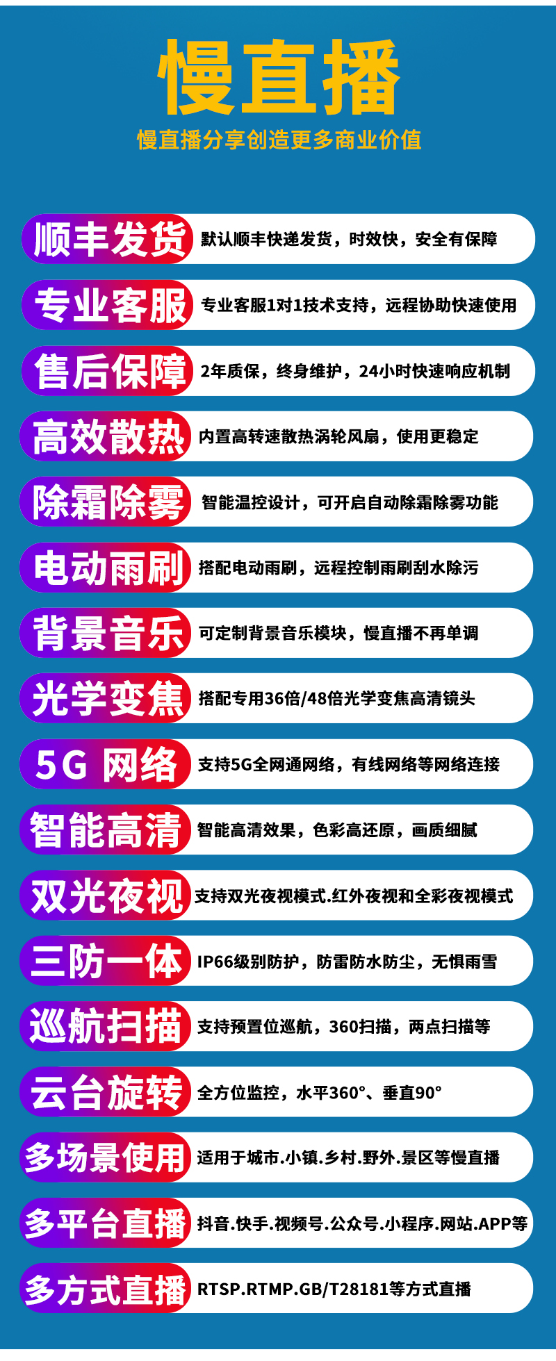 - 1、4K800萬(wàn)6寸5G全彩慢直播智能球機(jī),一個(gè)球機(jī)就是一套慢直播系統(tǒng);水平360度無(wú)限位旋轉(zhuǎn),垂直100度旋轉(zhuǎn);支持256個(gè)預(yù)置位 8組巡航8組掃描,支持水平掃描,2點(diǎn)區(qū)域掃描,隨機(jī)掃描;36倍/48倍光學(xué)變焦,半金屬外觀,IP66防水等級(jí);