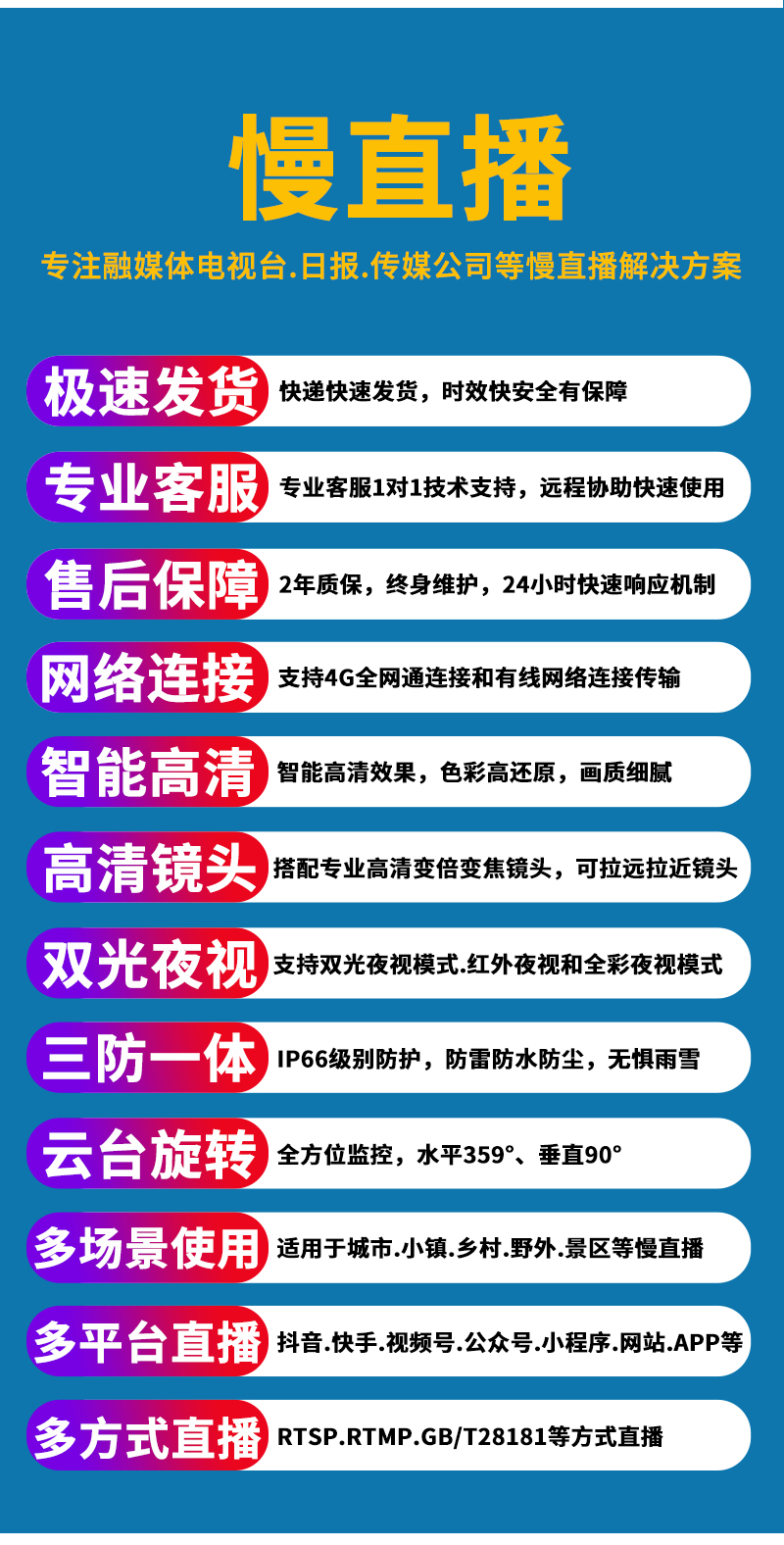 - 1、3寸4G6倍變焦慢直播智能球機,一個小球就是一套慢直播系統(tǒng);支持水平和垂直旋轉(zhuǎn);
